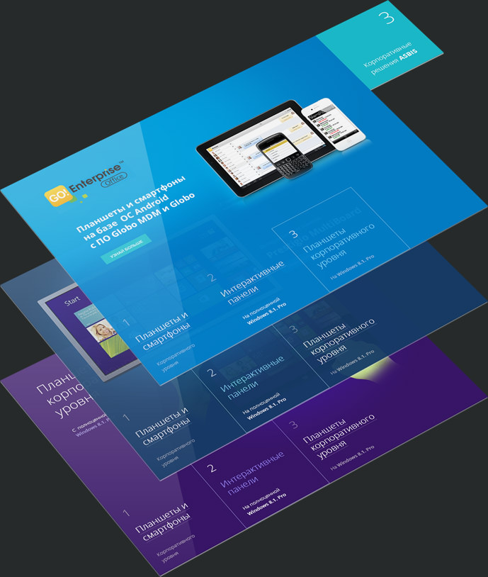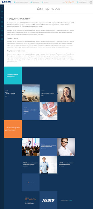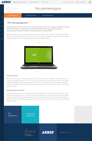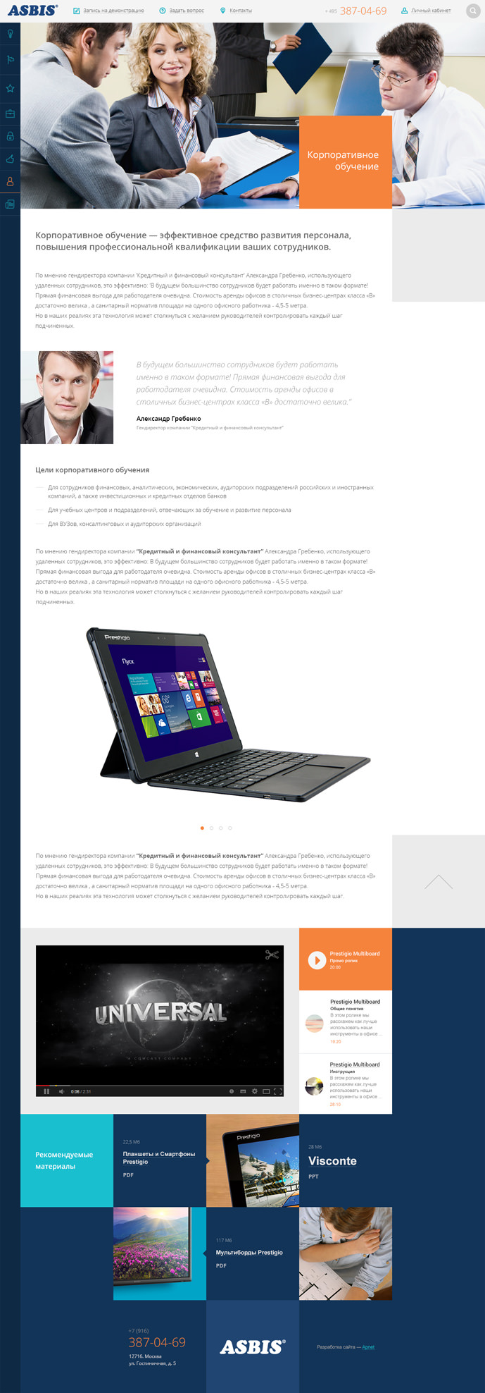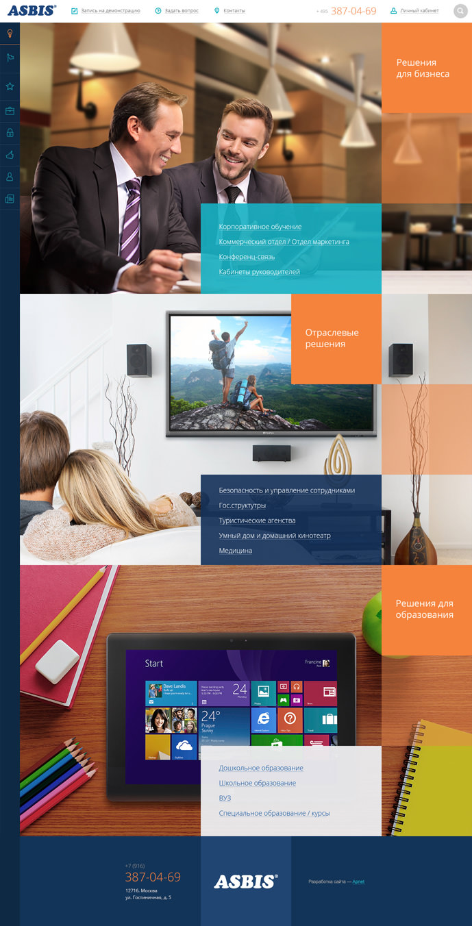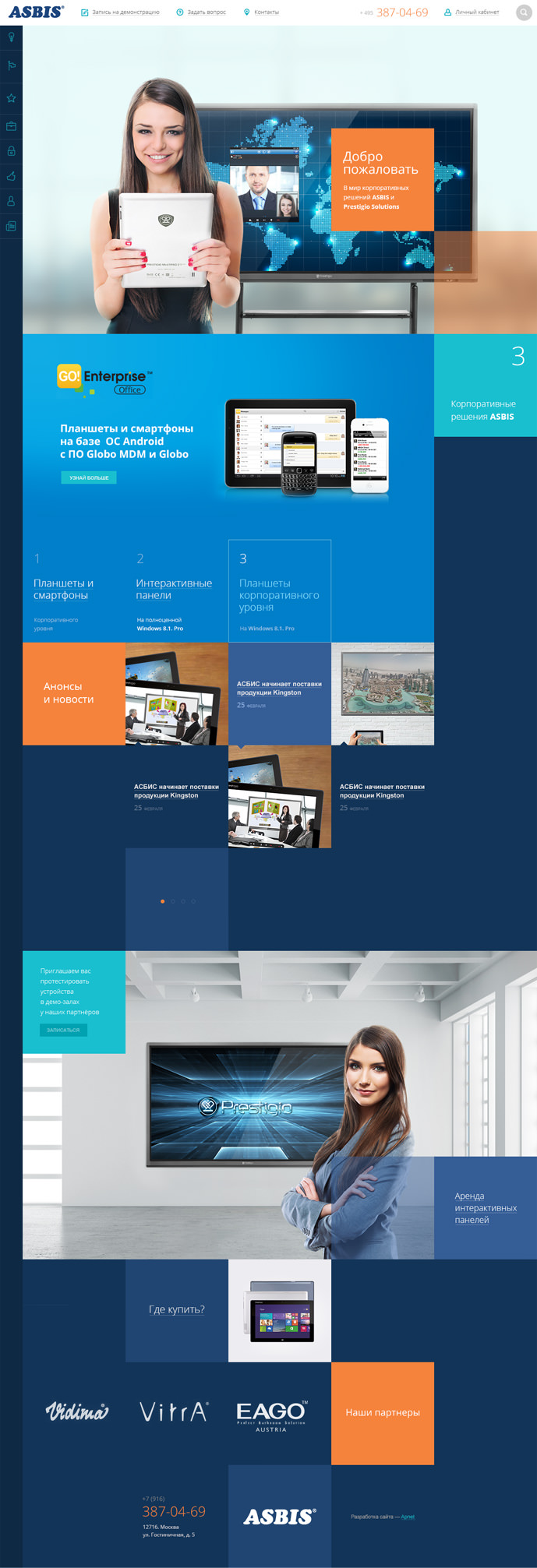 Для освещения программных решений от компании Асбис был разработан портал. Компания предлагает интерактивные панели, планшеты и смартфоны, которые ориентированы на разные образовательные, отраслевые и бизнес-решения. Дизайн портала выполняет презентационную роль, и комфортная система навигации помогает посетитителю быстро ознакомиться с интересующим продуктом.
